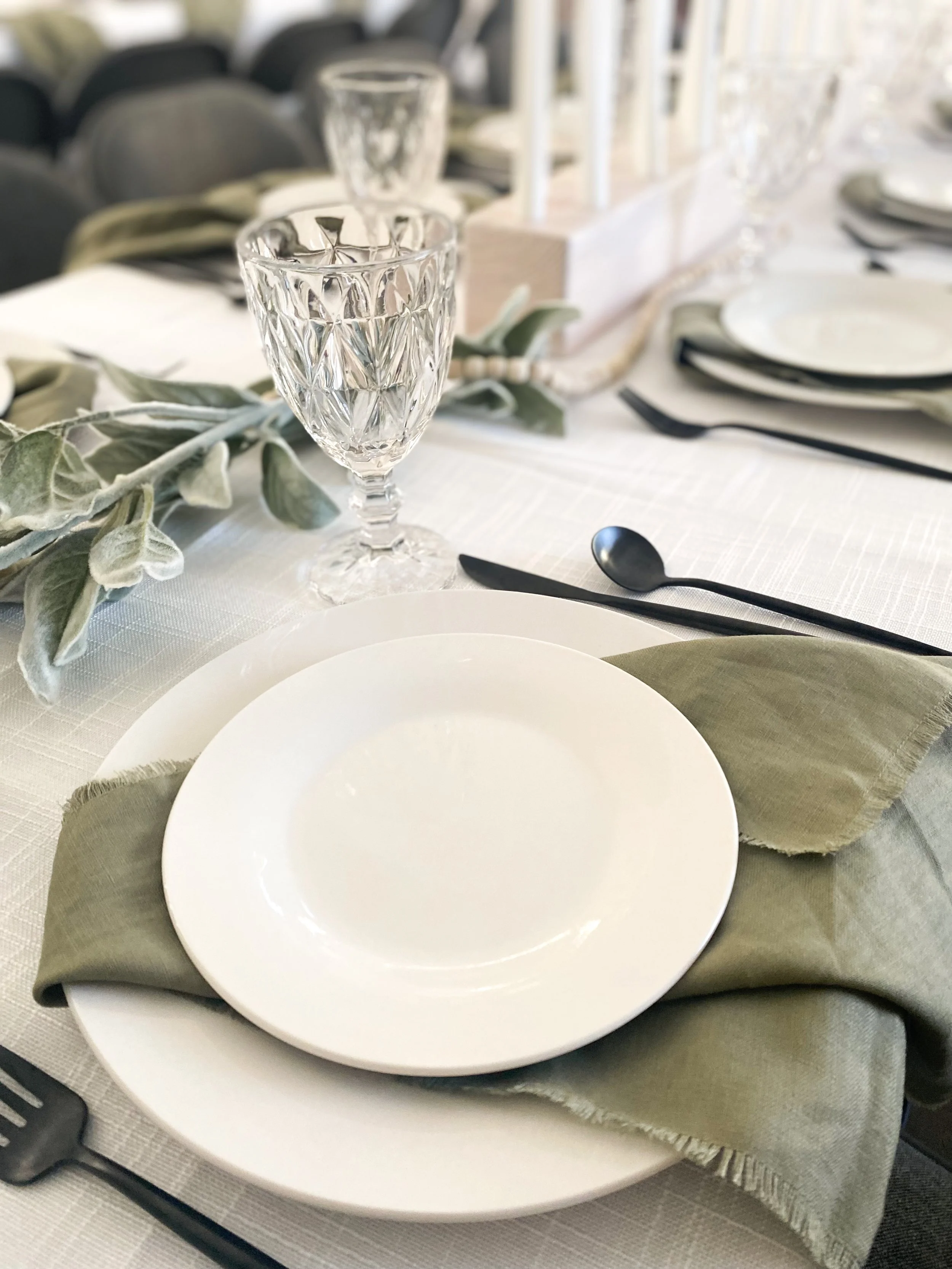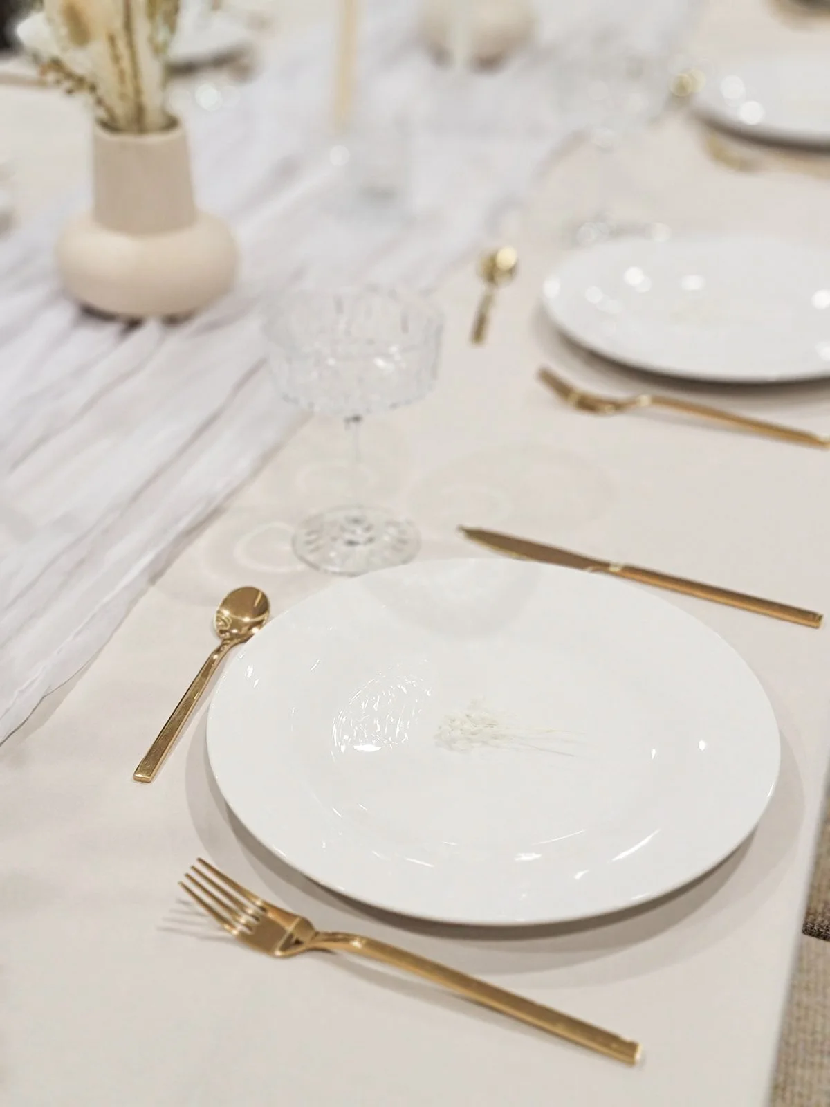 Glossy white dinner and salad plates make for a classic table setting. Available to be rented separately or as set.